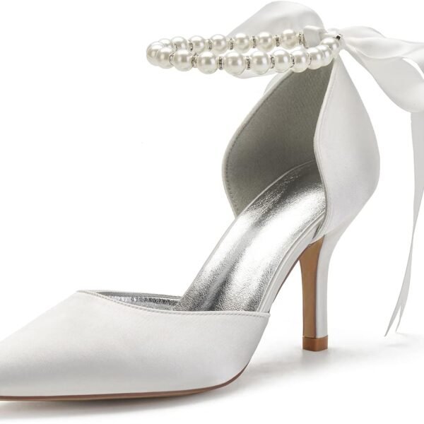 Pointed Toe Pumps High Heel Ankle Strap Dress Shoes Wedding Party Pump with Pearl 3.54”