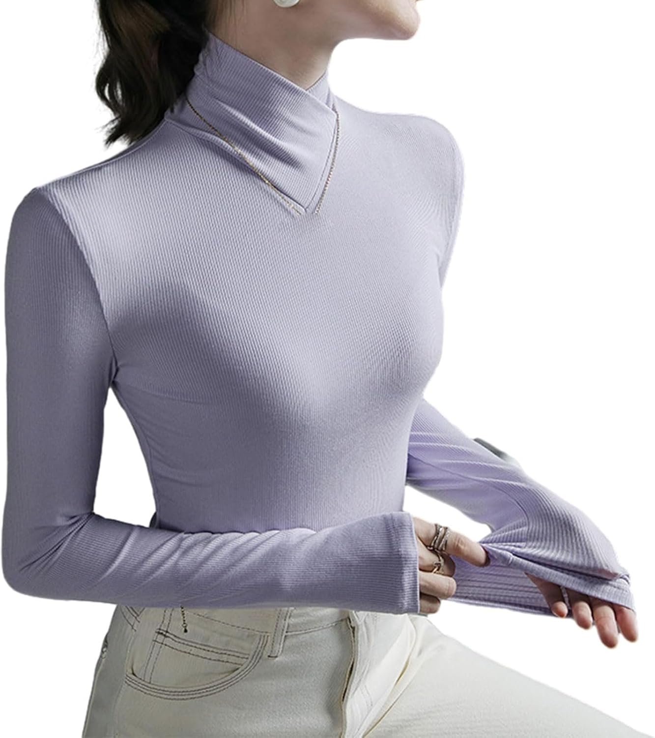 Fleece Crossover Turtleneck, Women High Stretch Mock Turtle Neck Long Sleeve Bottoming Pullover Tops