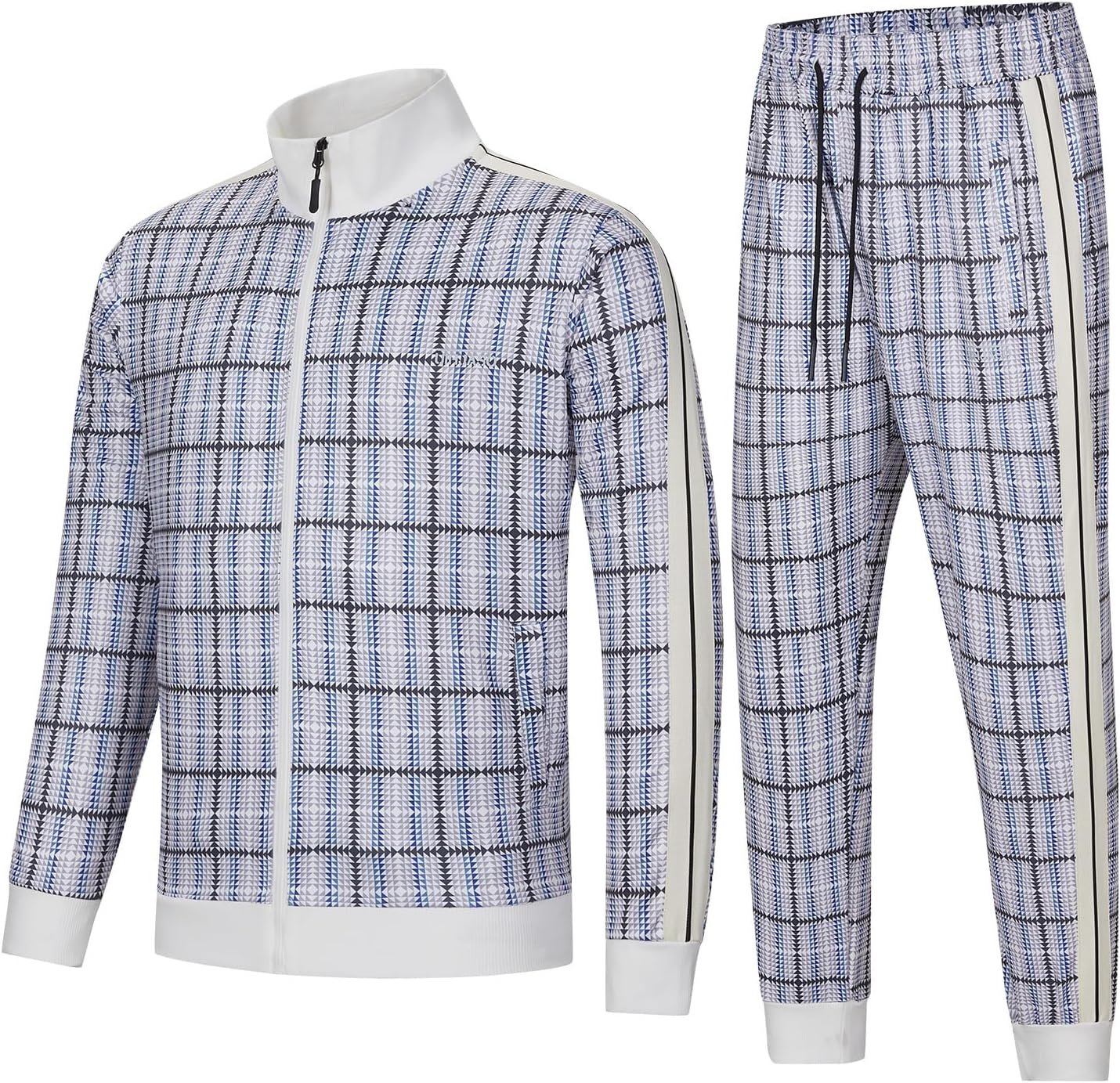 • Design: Men’s plaid tracksuit set consists of a jacket top with a stand collar,long sleeves,front zipper,double side pockets and jogger pants with an elastic waistband.