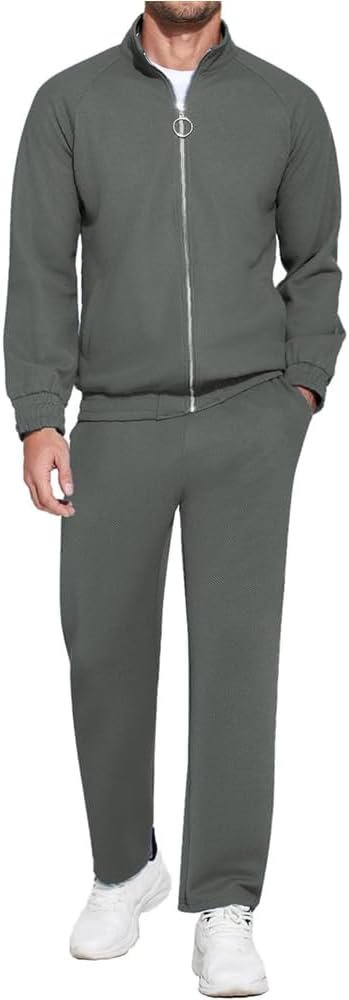 - Track Suit 2 Piece:Mens sports suit jacket featuring with full zip, long sleeve, with two big pockets to keep your hands warm or store.The straight pants with the adjustable waistband for a better fit, with two side and one back pockets for carrying essentials.