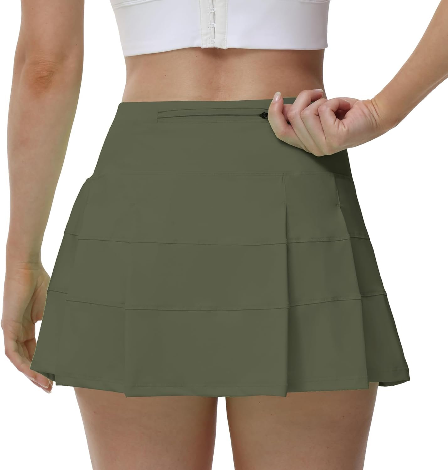 - 【Design】:High waisted tummy support,Pleated,Liner short has 2 side pockets and The back zipper pocket can put down the phone