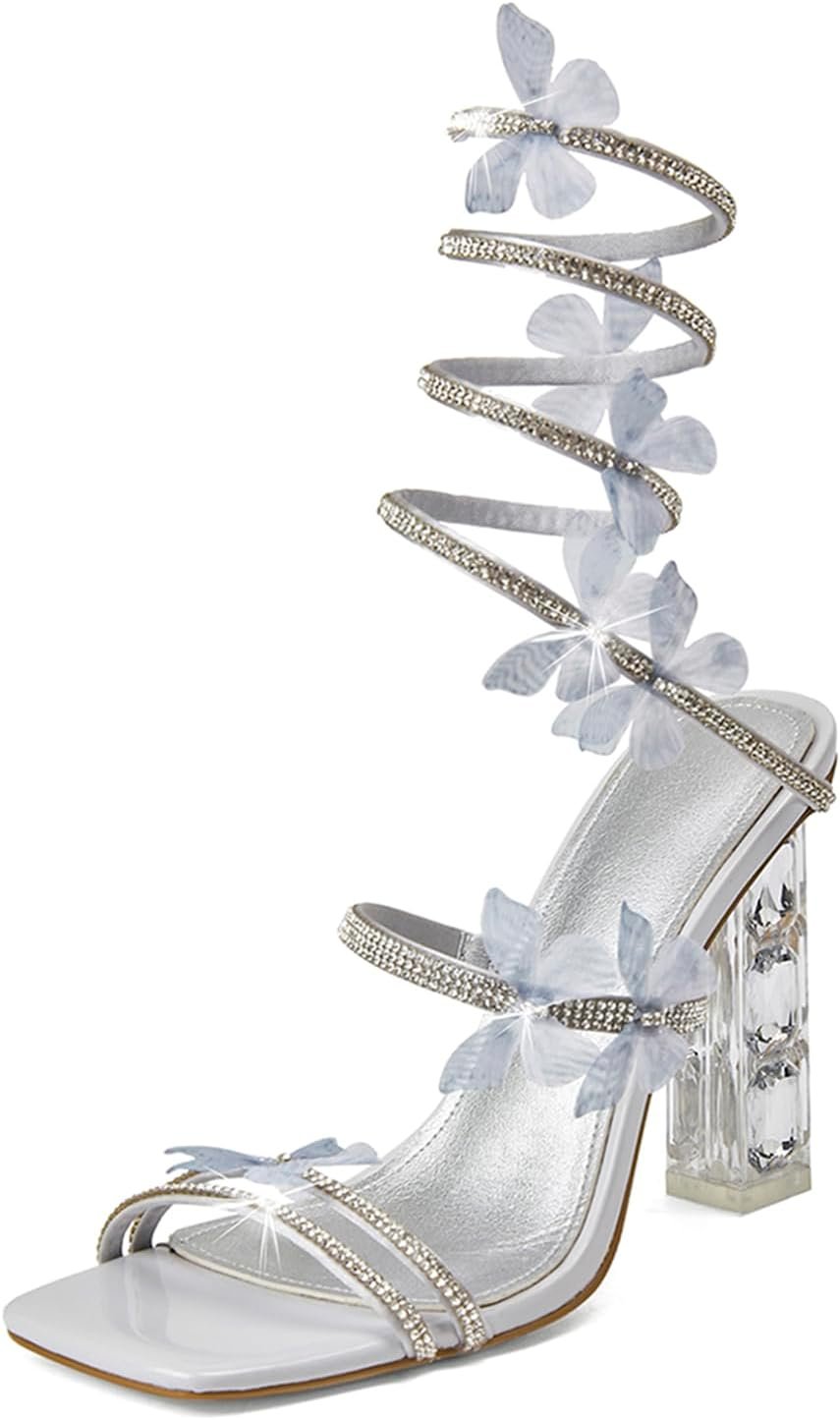 - Elegant Design: These rhinestone-embhed sandals feature a sparkling square open-toe design with a stunning spiral strap adorned with delicate butterfly decorations, creating a chic and glamorous look for formal occasions