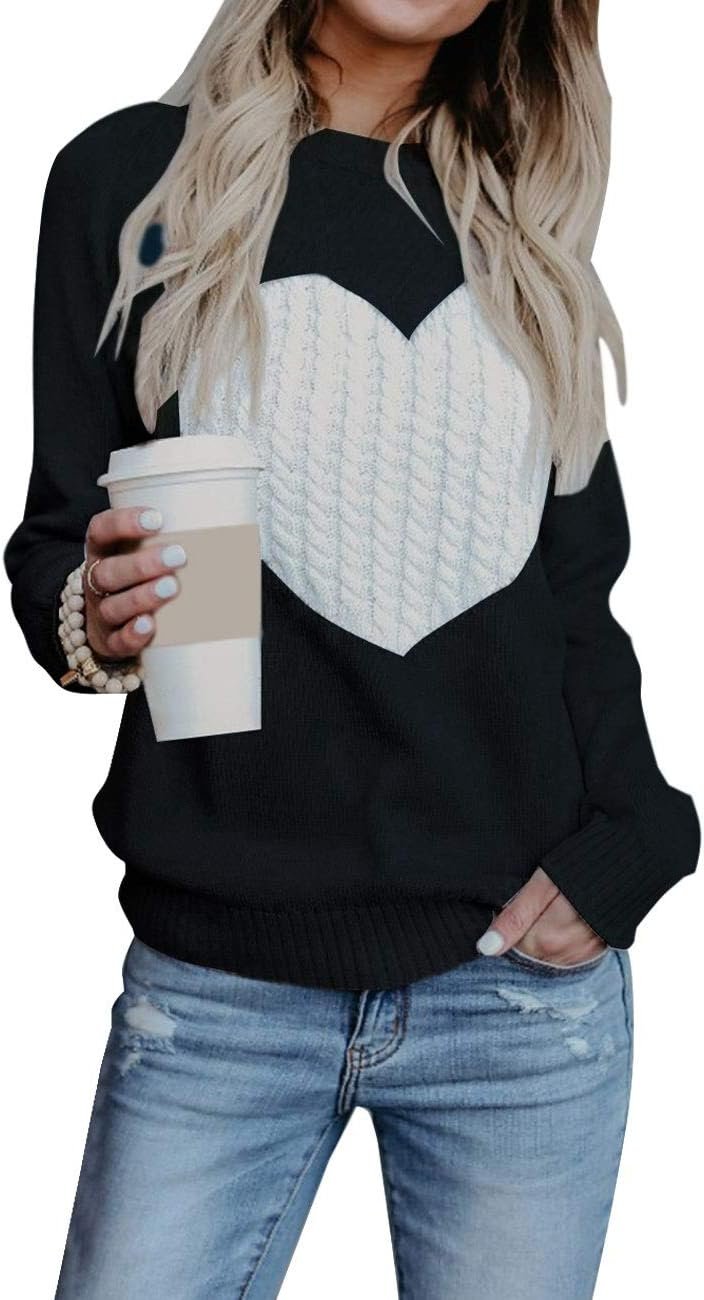 Women Cute Heart Sweater Long Sleeve Crewneck Pullover Ribbed Knit Casual Sweaters