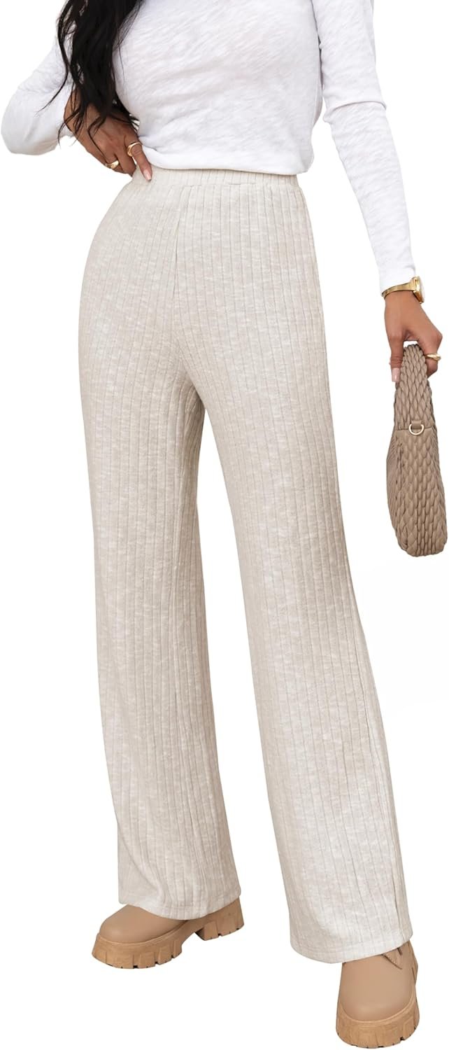 Women Ribbed Knit Wide Leg Pants Elastic Waist Straight Leg Palazzo Loose Fit Pants Trousers