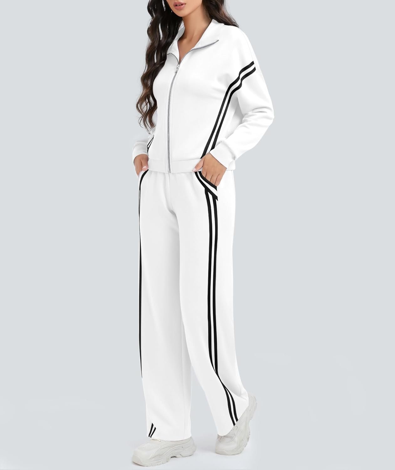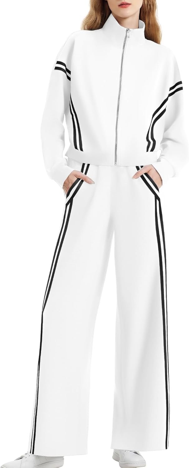 - 【Eye-Catching Design】Women’s tracksuit features contrasting side stripes for an elongated effect. Zip-up, long sleeve, stand collar jacket, high waist, wide-leg pants, with pockets, loose fit to suit all body types. It is a versatile suit that meets comfort, style and practicality