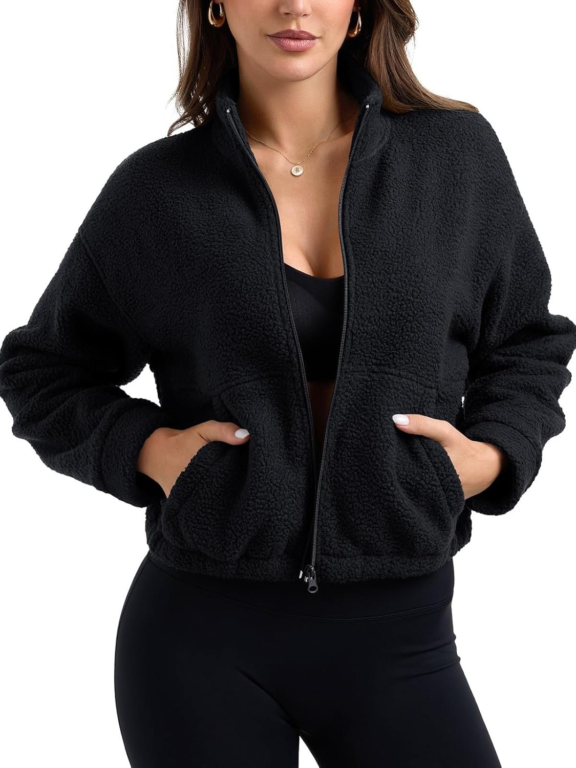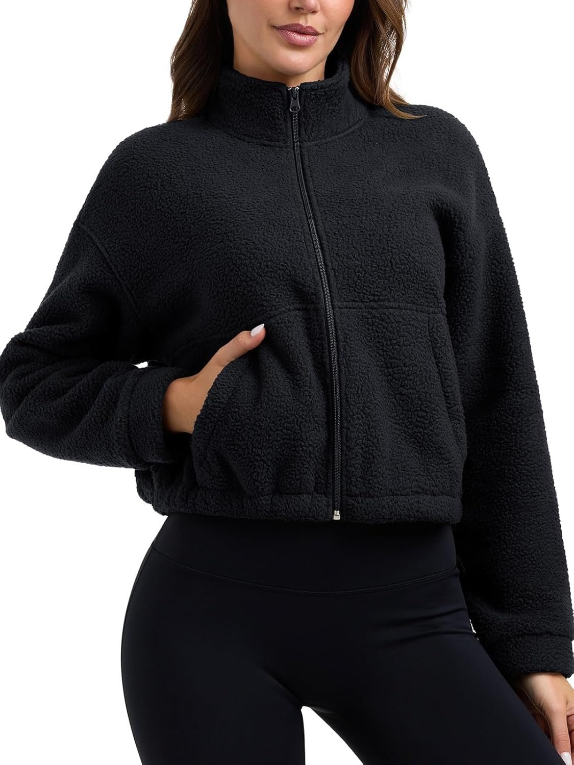 - Stylish Features: This fleece sherpa jacket featuring popular full zip up and stand collar,short cropped jacket and elastic bottom design can sit on your hips and bum for a sportier/hotter look!