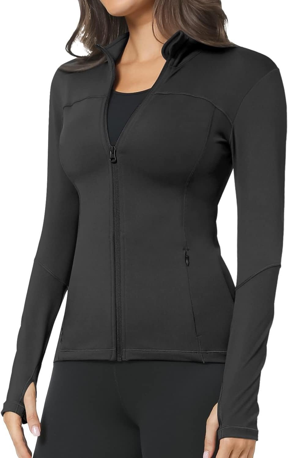 - Full-Zip Jacket with Thumbholes: These women’s slim fit running jackets are coming with a stand-up collar and thumb holes that keep your sleeves from riding up until you want them to. Wear it fastened up to the chin as you start off your outdoor run or walk, or indoor workout, then lower the zipper to let in a little air as your body warms up. Stash all of your essentials in the pockets and secure with a quick zip